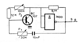 This circuit generates pulses from 0.5 Hz to 500 kHz, adjusted by potentiometer P2. The transistor can be the BC547 and the supply voltage must be 5 V. The circuit is from 70's documentation.