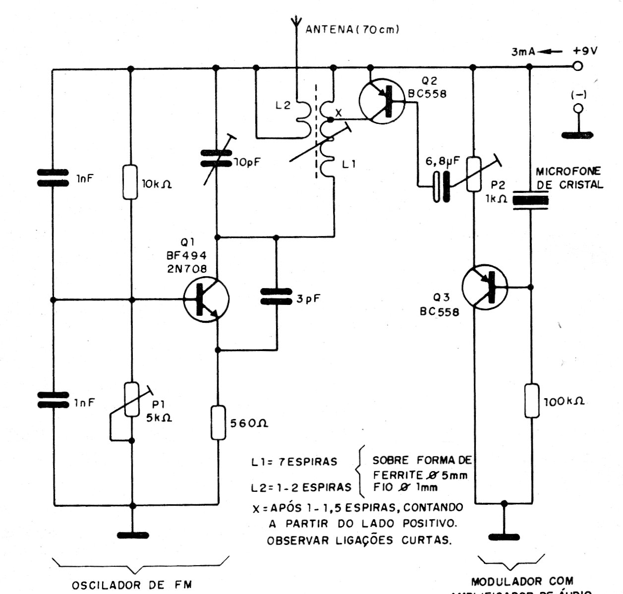 This small crystal microphone transmitter was indicated in an 80s spy book. The range depends on several factors, for example, the sensitivity of the receiver. Next to the circuit, the characteristics of the coils are given.