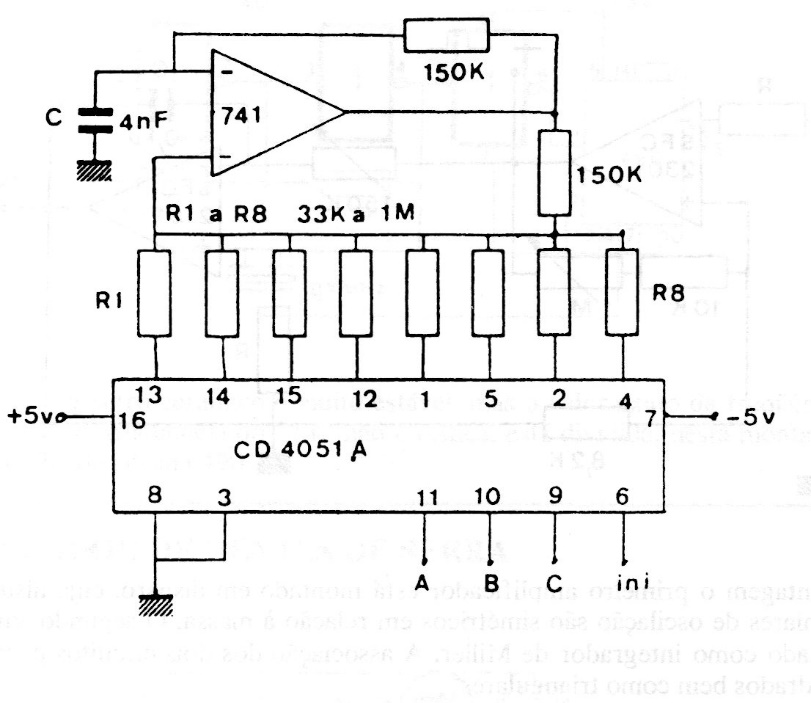 The frequency of this CMOS oscillator depends on the capacitor C and the 4051 output that goes to the high level. This output is determined by the commands on digital inputs A, B, C and D. The operational must have symmetrical power and the maximum frequency is limited to a few hundred kilohertz.