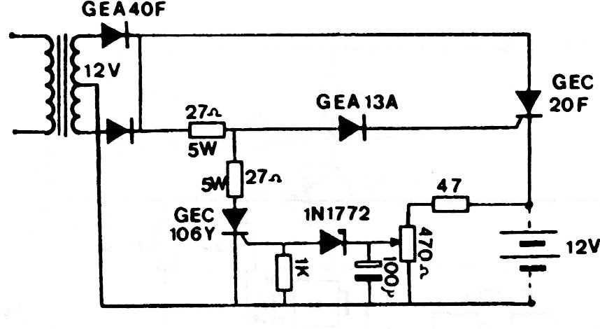 This charger was found in a General Electric circuit manual from the 1960s. The circuit is still current and can be implemented with current SCRs and other equivalent components. The transformer is 12 V x 5 A. The potentiometer must be adjusted to disconnect the charger when the charge is complete.