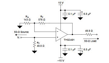 This 320 to 900 MHz amplifier with the Texas Instruments TSH3491 integrated circuit was obtained from the component's own datasheet. The circuit directly supplies a 50-ohm load with 500 mA current reaching a gain of 5 V / V. The circuit requires symmetrical power supply.