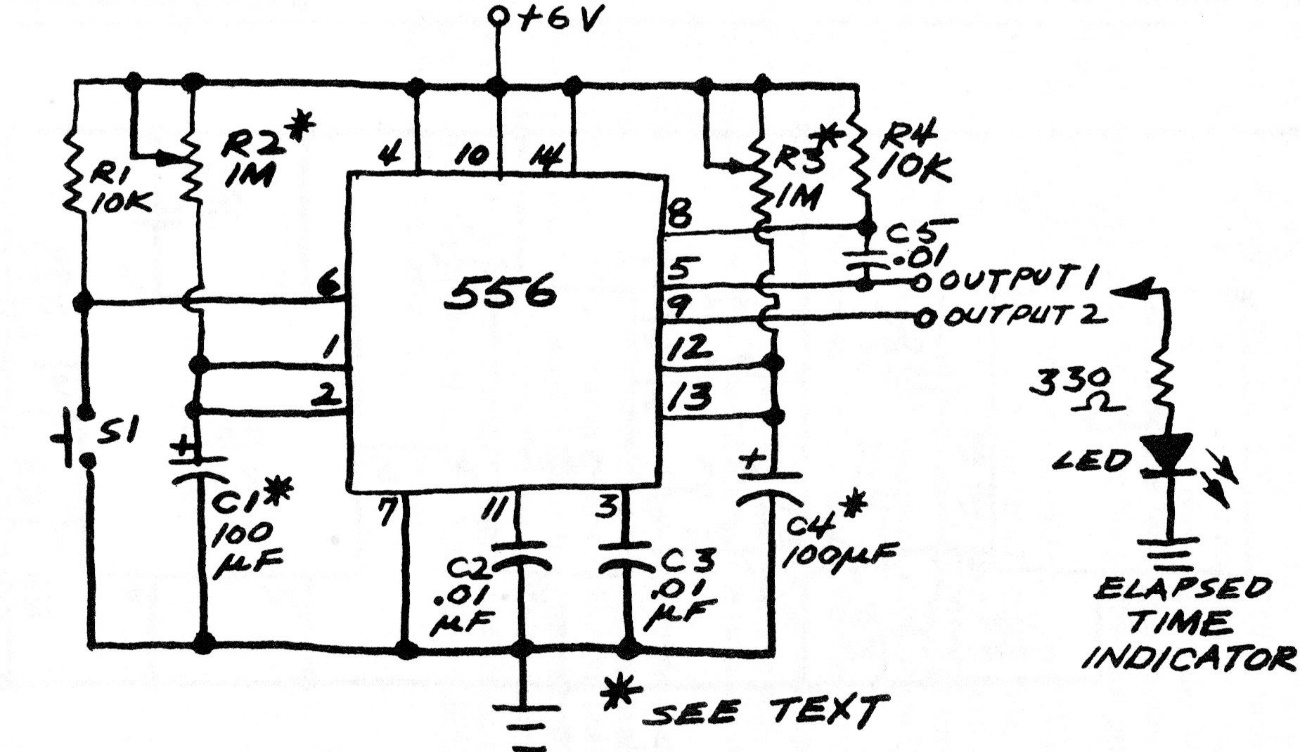 In fact, the 556 consists of a double 555, which can be replaced by these integrated ones. The circuit has a first timer set at R2 and a second timer set at R5. Capacitors C1 and C4 determine the values of these timings. The outputs have LED indicators, but power steps can be used to activate relays.