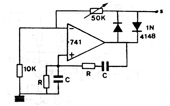 This oscillator circuit for sinusoidal audio signals with operational 741 requires a symmetrical power supply of 6 to 12 V. The circuit is from an old documentation and the frequency is given by RC. Other operational amplifiers can be used.