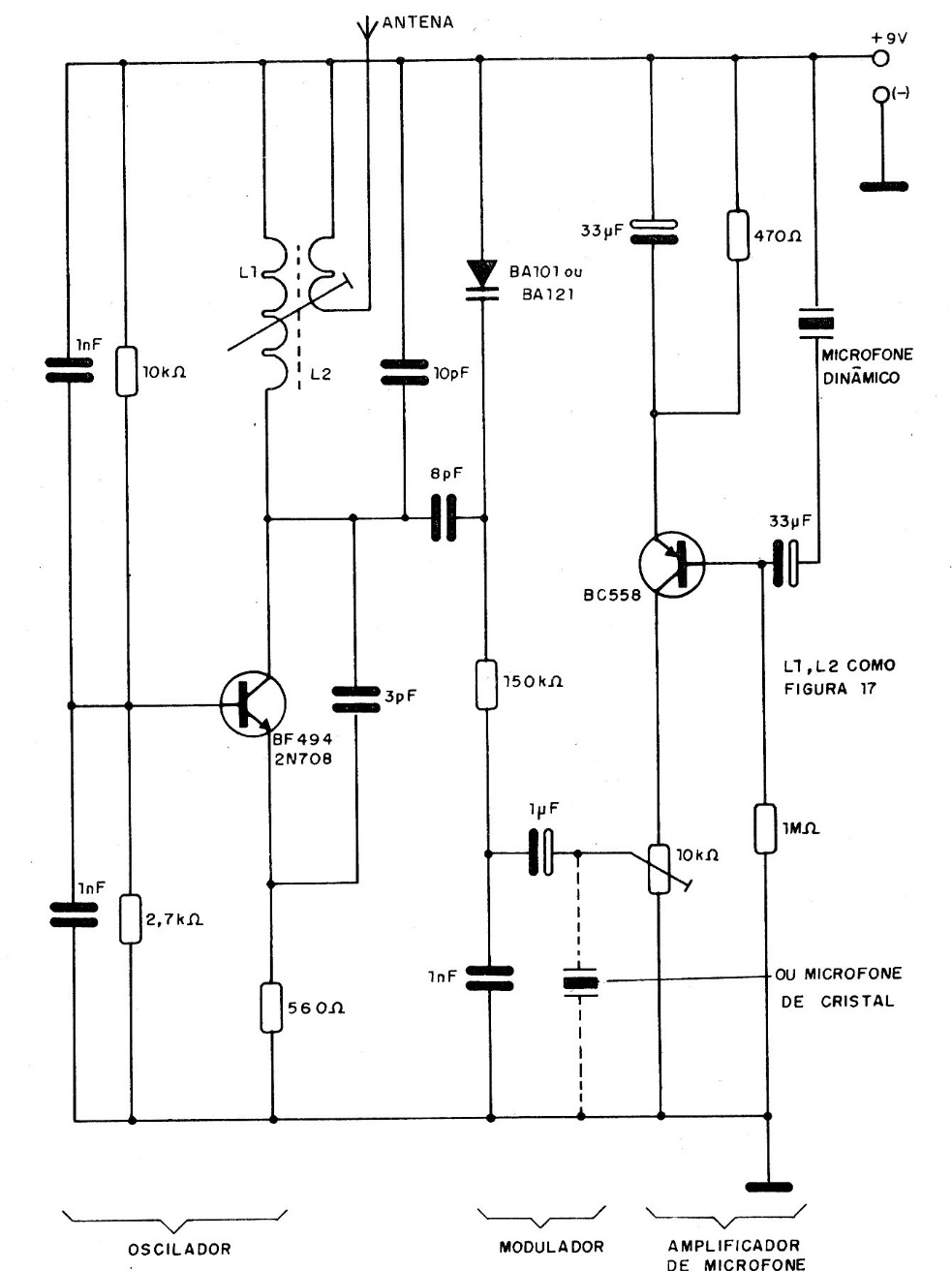 This circuit with variable capacitance diode (varicap) is from a publication from the 90s. The coil is as in the CB19425E project and the transistors admit equivalent as well as the varicap diode. The power is powered by a 9 V battery and the frequency will be in the FM range.