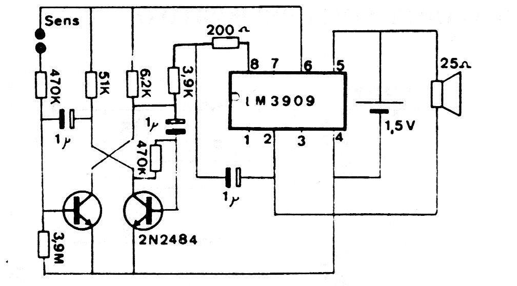The LM3909 tone generator integrated circuit of this application is uncommon nowadays. The circuit can operate on a single battery and is very sensitive.
