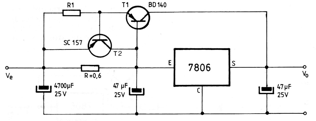 This circuit includes a protection system for the previous circuit (CB19302E) in case of a short circuit at the output. The transistor can be the BC557 and both the integrated and T1 must be mounted on heat sinks. The input voltage must be 2 V higher than that desired at the output.