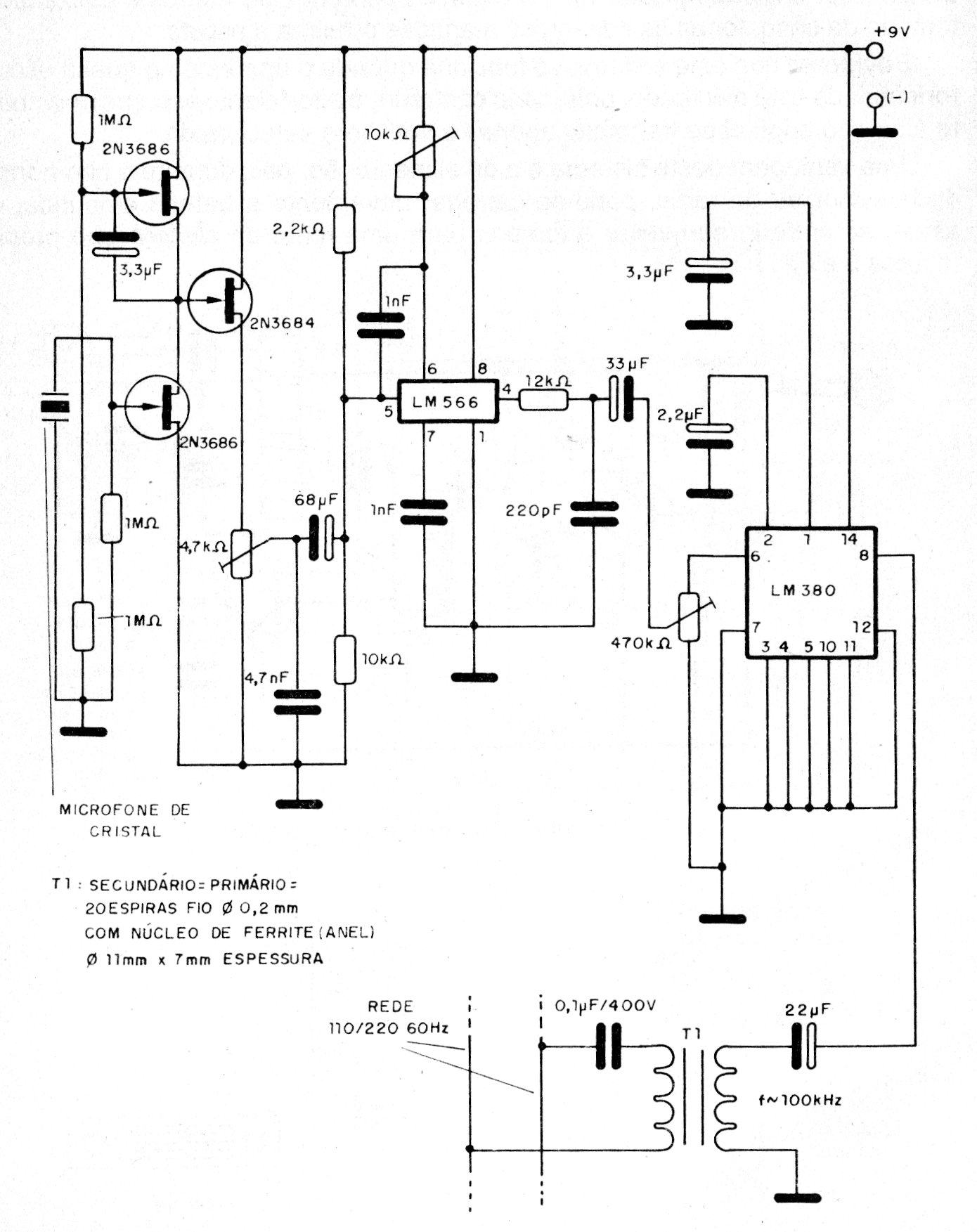 This circuit transmits the signal taken from a telephone line to a receiver placed nearby (up to a few tens of meters, depending on network noise). The circuit is from the documentation of the 90s and operates at a frequency of 100 kHz. The receiver is CIR19326E.