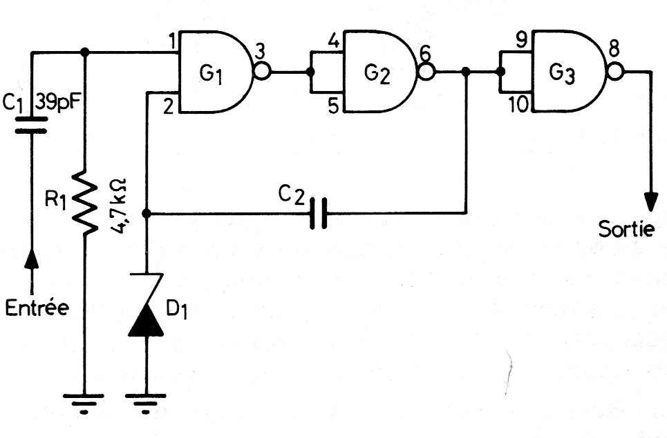This TTL trigger circuit with the 7400 can be used as a signal conditioner in an input shield for microcontrollers. The circuit is old, but the application is modern. The supply must be made with 5 V. We found the circuit in an old European documentation. Zener is 3 to 3.7V.