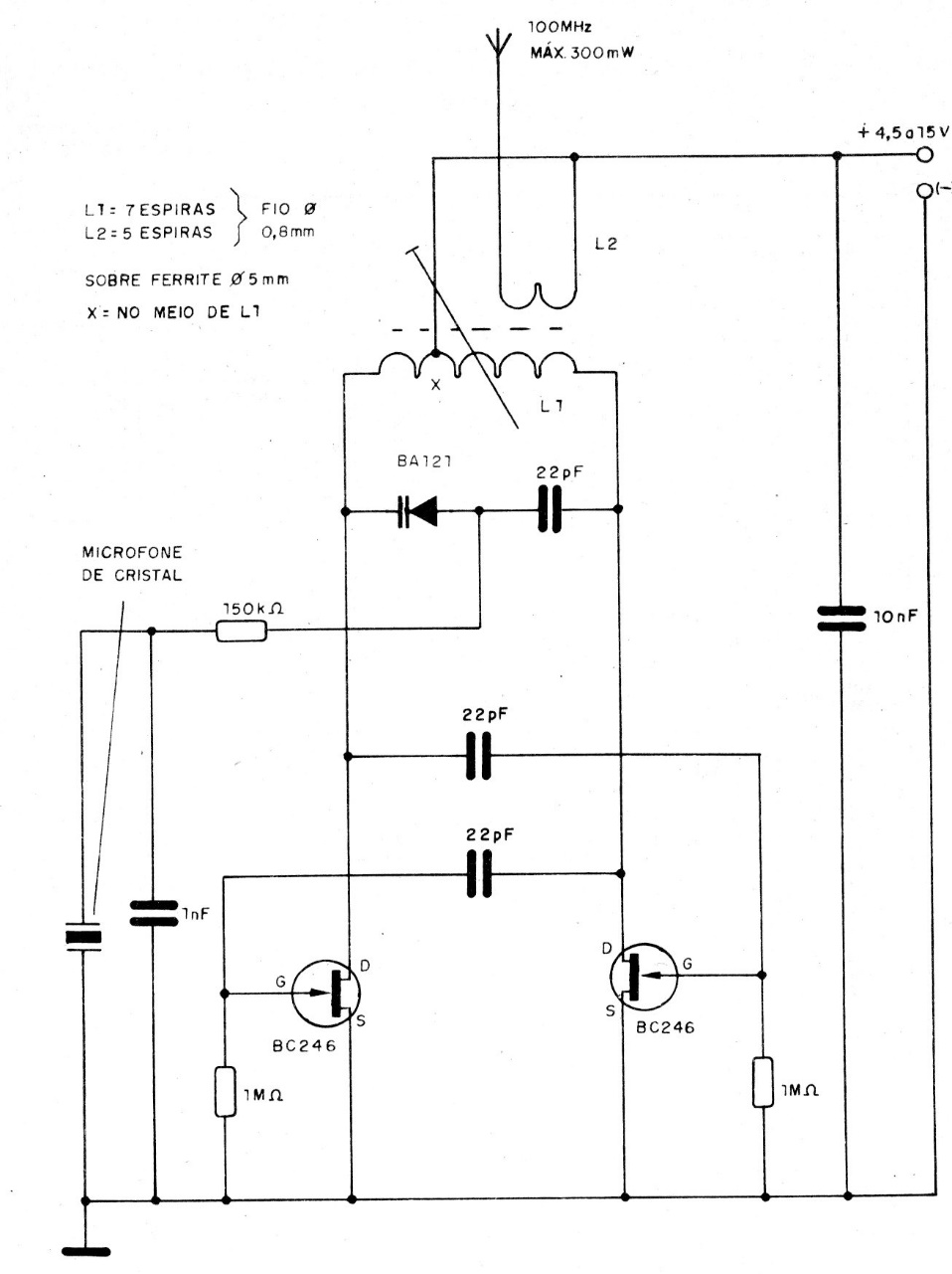 This transmitter with FET in counterphase was obtained in a documentation from the 90's. The transmitter has modulation by crystal or ceramic microphone and details of the coils are given next to the diagram.