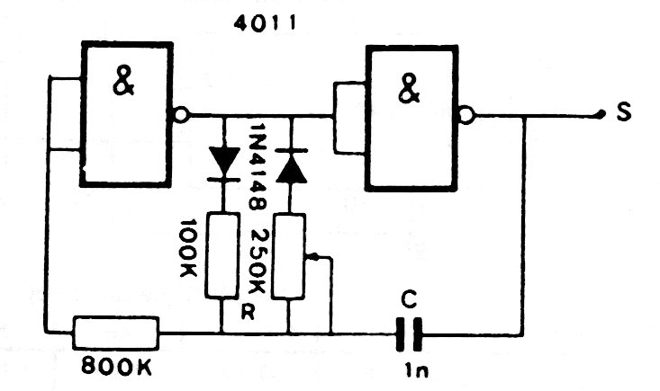 This is a traditional CMOS configuration found in other articles in this section and on this website. The diodes are for general use and the frequency depends on the capacitor. The potentiometer adjusts the space between the pulses and the power can be done with voltages of 3 to 15 V typically.