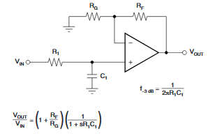Texas Instruments LMV3xxA operational amplifiers are low voltage types (2.5 to 5.5 V). In the figure we have a low-pass filter using this component and next to the diagram the formulas for calculating the components. The power supply must be symmetrical.