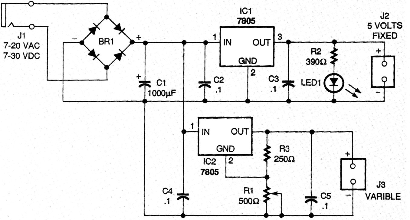 This double bench source has a fixed voltage output and an adjustable voltage output with current up to 1 A. The integrated circuits must be mounted on heat sinks. The diodes can be 1N4002 and the transformer using the input, which does not appear in the diagram, must have 7 to 20 V of secondary voltage with 2 A.