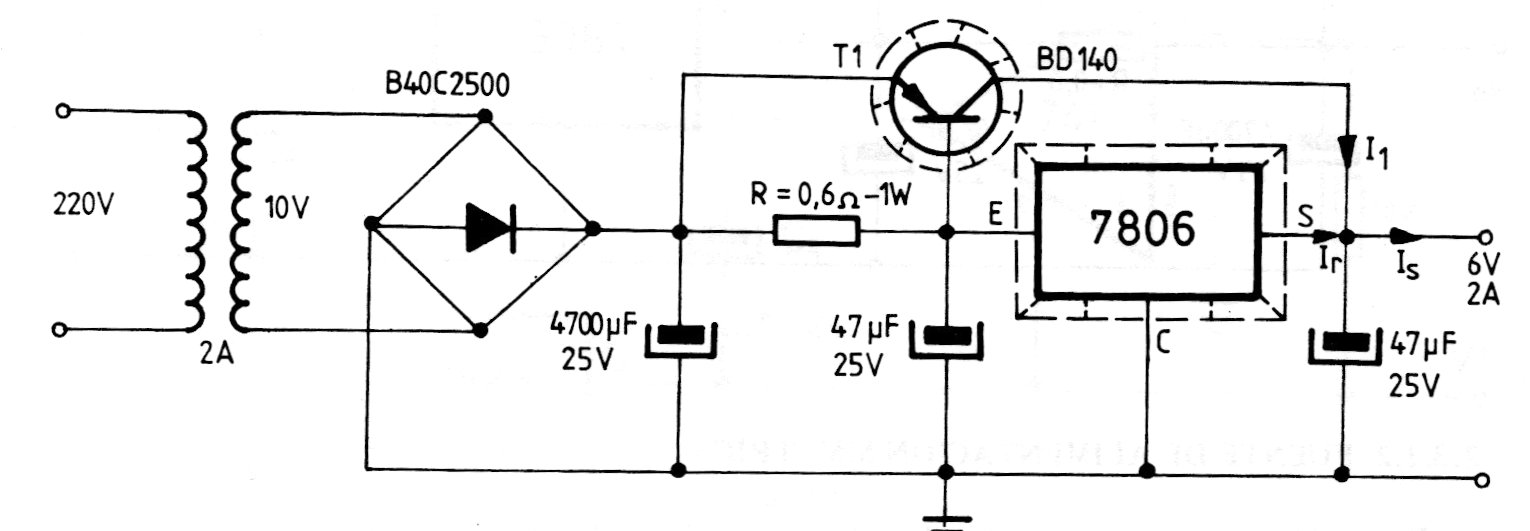 In the figure we have a circuit that allows to increase the maximum current from a 78xx to more than 1 A, which is its specified current. The transistor determines this current, which can be the TIP42 for currents up to 3 A. The transformer must have the current desired at the output and both the transistor and the integrated circuit must be mounted on heat radiators.