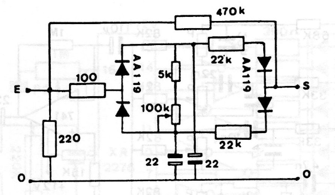 This passive volume compressor was found in documentation from the 1980s. It needs a good pre-amplification step to compensate for signal attenuation. Compression is 20 dB for an input of 100 mV at 10 V.