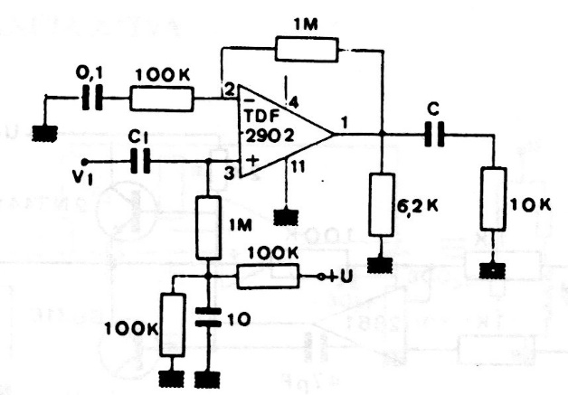 This circuit was obtained in an old European documentation. The integrated circuit used is uncommon today, but the configuration is valid for other operators. Note that the font is not symmetric. Its tension depends on the operational and the application.