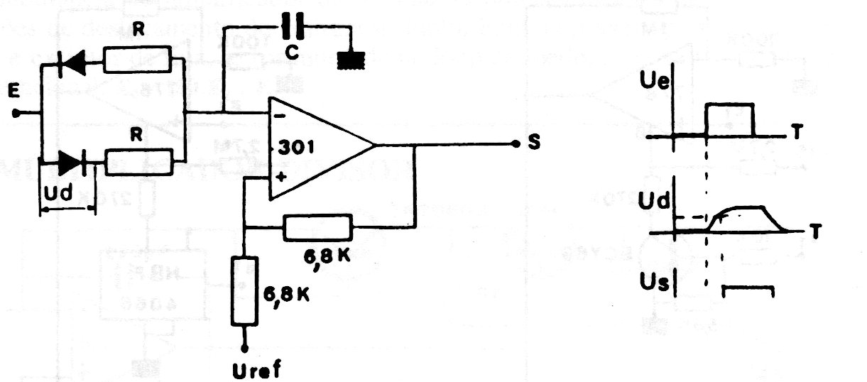 This circuit slows down a pulse applied to its input. The delay depends on the capacitor and equivalent integrated circuits can be used. The circuit response is given next to the diagram and the power supply must be symmetrical with voltage according to the application.