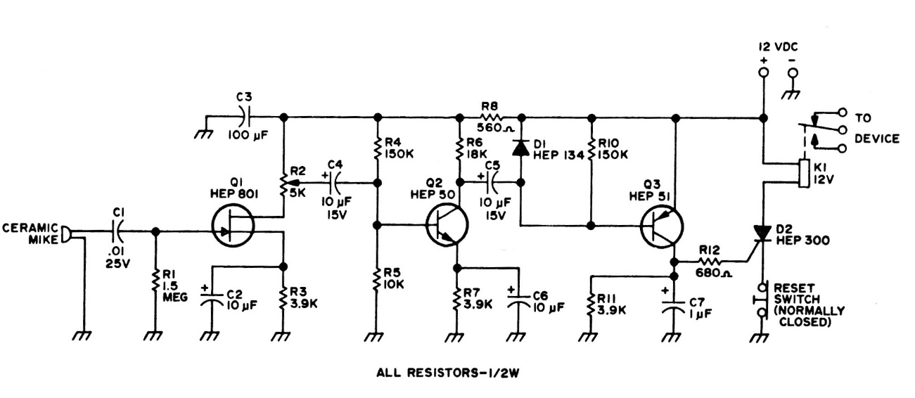 This Vox or sound activated relay was found in an American documentation from 1975. Equivalent transistors can be used, and the SCR can be a TIC106. The relay is according to the supply voltage.