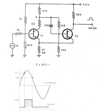 This trigger circuit with transistors, which may be 2N2222, was found in a 1967 publication. The circuit is still current, serving to obtain rectangular pulses from sinusoidal input signals. The input resistor depends on the signal strength applied to the circuit.