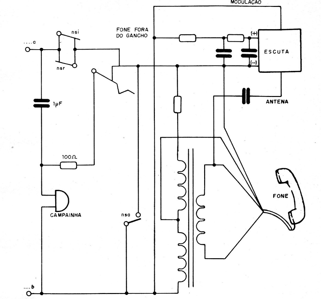 In the figure we have a wireless wiretapping circuit for the frequency range determined by L1. For FM it can be 1 + 4 turns of wire 28 without form with 1 cm in diameter and L2 3 turns on L1. The circuit is from a documentation of the 90s, serving for the analog part of the telephone line.