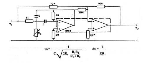 This circuit is from 80s documentation and makes use of common operational amplifiers. The formulas for calculating the components are given next to the diagram. The power supply must be symmetrical.