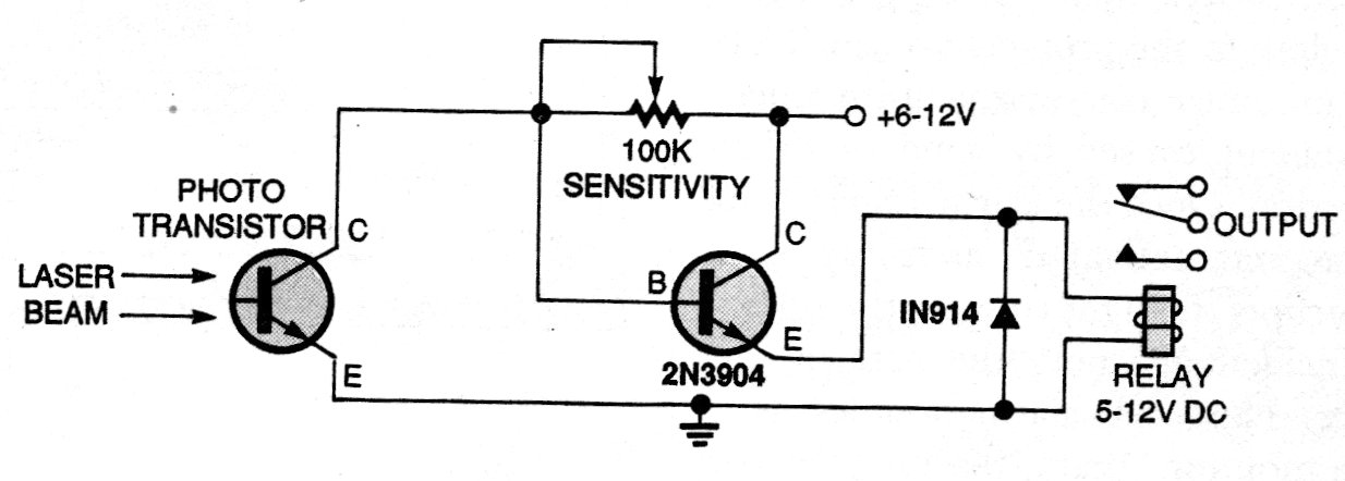 This circuit was indicated in an old American publication to serve as a Laser alarm system as a receiver. The laser can be a laser pointer or another and the potentiometer adjusts the trigger point. The power can be 6 or 12 V depending on the relay and the transistor is a BC548.