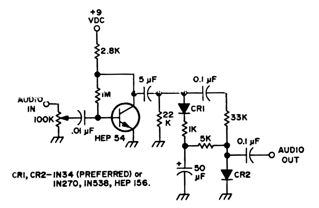This circuit, from a Motorola manual, uses transistors from the time, but can be implemented with a BC548. The diodes are general-purpose, and the power must come from a source or battery since consumption is low.