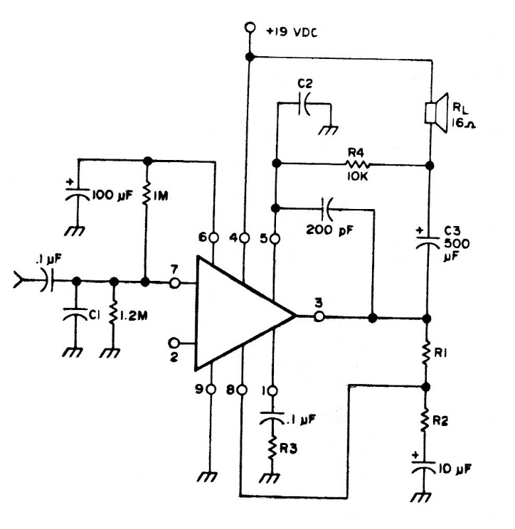 This integrated amplifier was used in televisions from the 70s, with good sensitivity characteristics. The circuit was powered with 9 V.