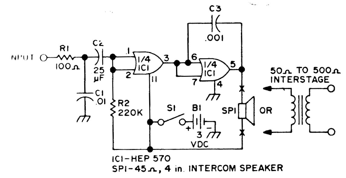 This configuration found in a Motorola documentation consists of an experimental circuit that uses logic functions like amplifiers. The circuit may need modifications to work with modern equivalent components.