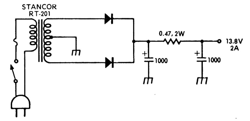 This 13 A V power supply with 2 A uses a transformer with 12 V of secondary and 2 A of current. The diodes can be 1N5404 or equivalent for 2 A or more.