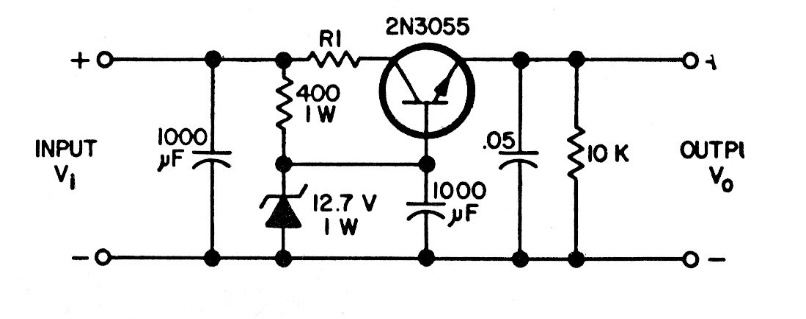 The output of this voltage regulator depends on the zener diode. The current depends on the transistor. For a BD135 the maximum current is in the order of 500 mA. With the TIP41 we can reach 3 A. The transistor must be equipped with a heat sink.