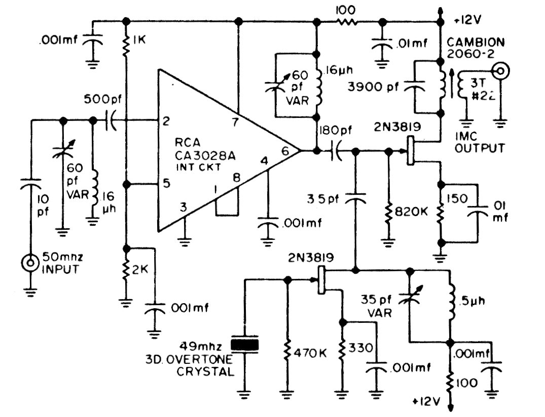 With this circuit it is possible to tune the signals in the 50 MHz band in a common AM receiver around 1 MHz. Information about the coils is not given and the integrated circuit used is uncommon nowadays.