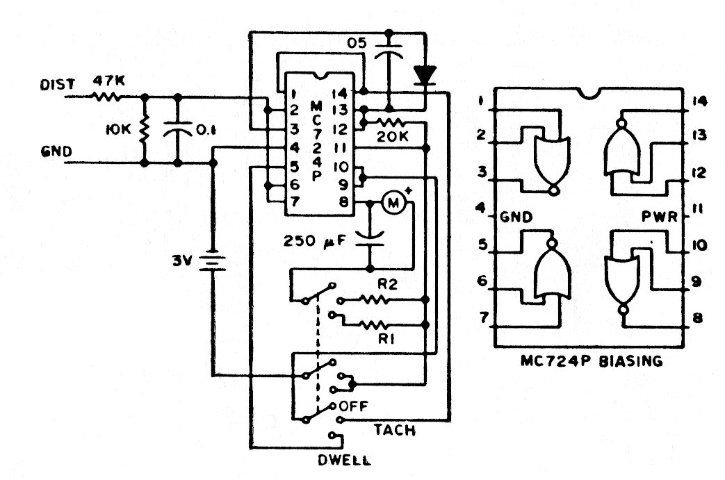 This tachometer and dwell meter for old cars was found in a 1975 documentation. The circuit is a reference for those who want to recover or maintain an old car.