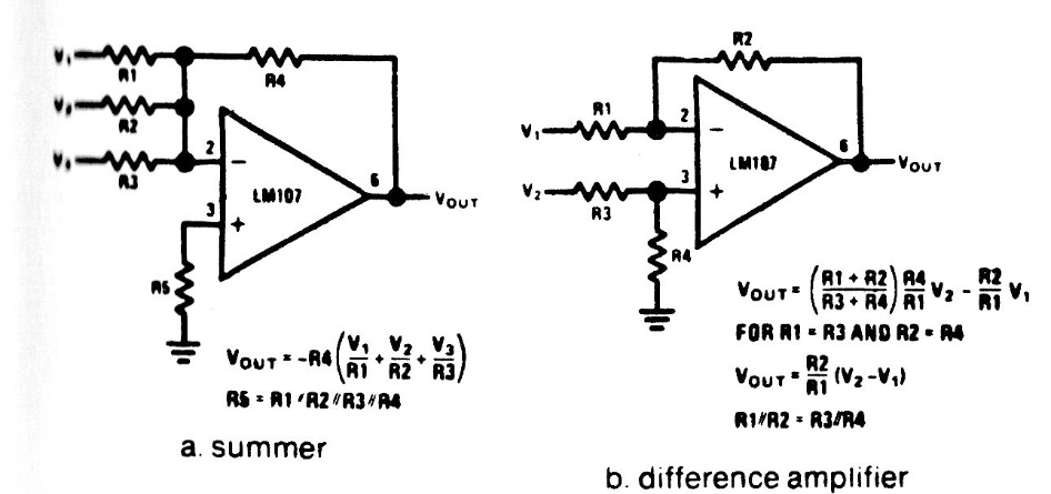 The two adding and differentiating circuits with operational amplifiers given below were obtained from American documentation from the 1980s. The circuits can be implemented with modern operationals requiring symmetrical sources.