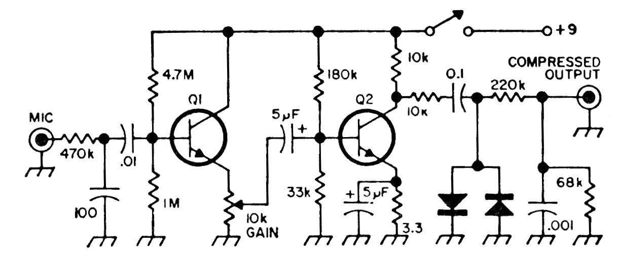 This limiter circuit with included preamplifier was found in an American documentation from 1975. The circuit uses general-purpose transistors of the time, which can be replaced by modern equivalents.