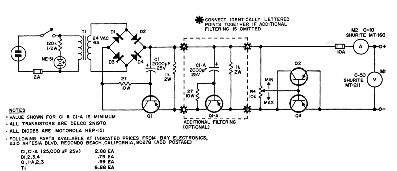 This power supply with several transistors can supply a current of several amps and a voltage of up to 24 V. The circuit is from an old documentation using transistors of the time. Modern equivalent transistors can be used.