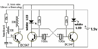 This circuit switched with the help of small inductors produces a peak voltage above 20 V that is sufficient to supply white LEDs from a 1.5 V supply. The circuit consumption is in the order of 10 mA, the inductors consist of 30 loops of very fine wire on a 1.5 x 6 mm ferrite.