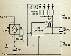 This sole beacon which has a battery charged by photocells was found in documentation from 1991. The LEDs flash at the frequency given by C2.