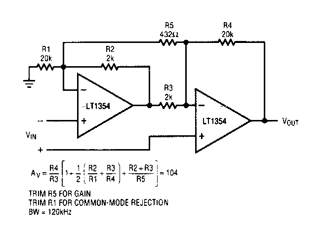 Found in Linear Technology documentation, this amplifier requires a symmetrical power source and its gain is given by the components according to the formula in the diagram.