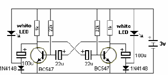 This circuit is powered by only 3 V and can flash white LEDs from 3.2 to 3.6 V, as it includes a voltage doubler. The blinking speed is given by the 22 uF capacitors that can be changed. The current in the LEDs is of the order of 2 mA.