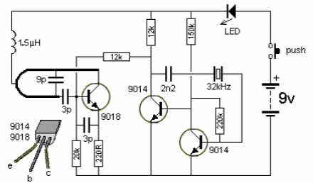 This circuit uses a lower frequency crystal in an excitation system for an oscillator with a coil made on the printed circuit board itself. Equivalent transistors can be used. The circuit was found in recent English documentation and is quite critical.