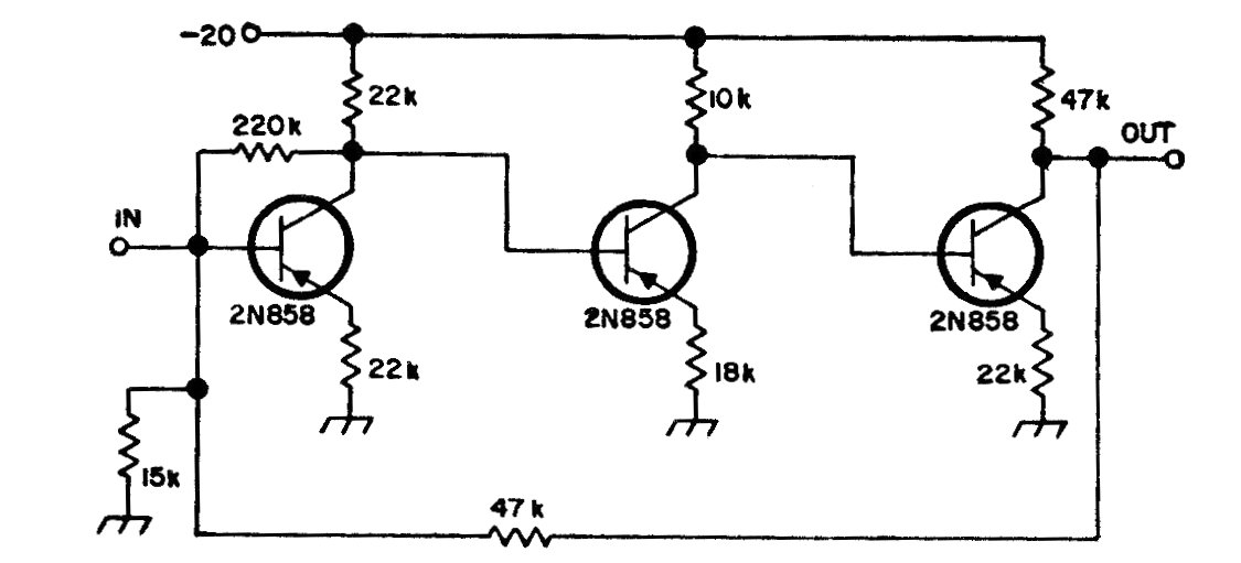 This circuit was found in a 1975 documentation. Current general-purpose transistors can be used, and the power is supplied with relatively high voltage. The gain is 30 dB.