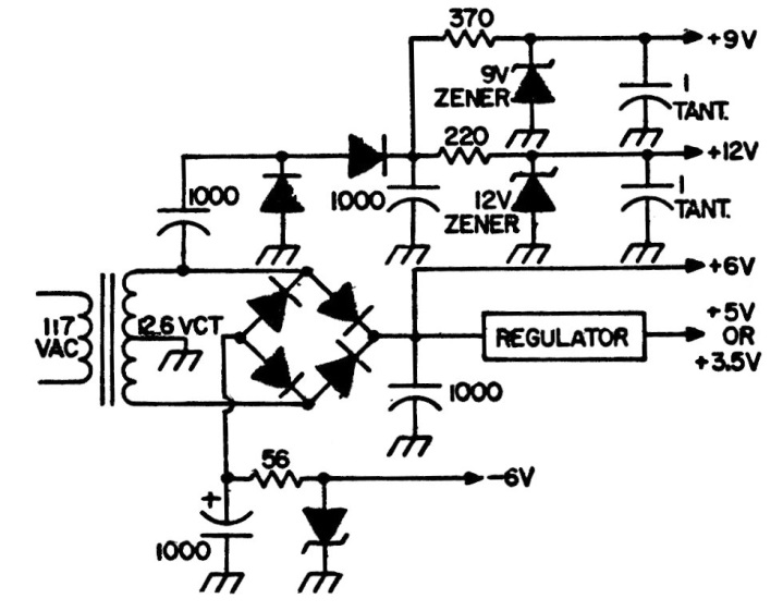 This simple low current source for the bench was found in ancient American documentation. The zeners are 1 W and the diodes can all be 1N4002. The transformer is 12.6 V with central socket and current up to 500 mA.
