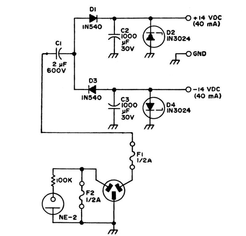This low current source without a transformer is intended for applications where insulation is not important. The circuit has a 110 V (120 V) input and was found in old American documentation.
