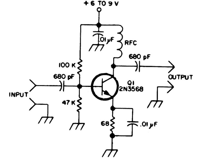 This amplifier for the 10 m (30 MHz) band has a gain of 12 to 15 dB having been found in an American documentation. Other RF transistors can be used like 2N2222 or 2N2218.