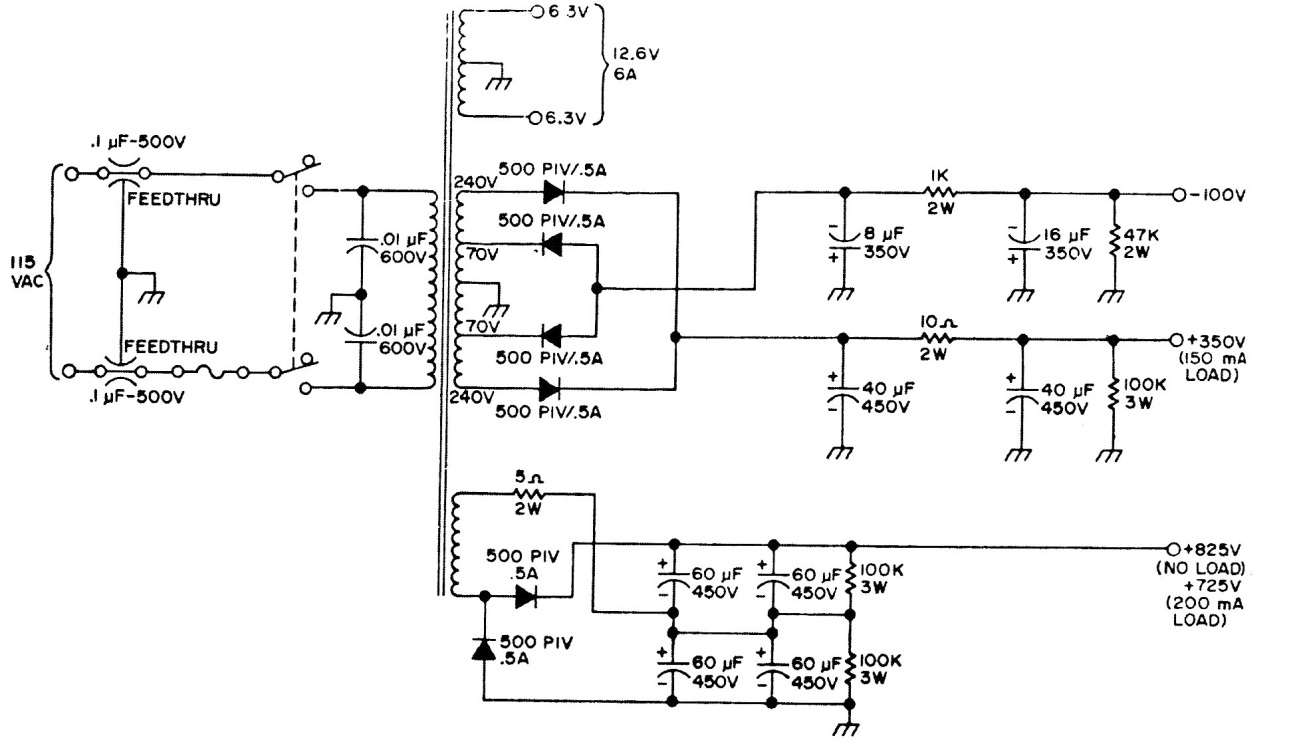 This source is indicated for the supply of high-power valve circuits and other types that require high voltages. The transformer has multiple windings, two of which are high voltage and one for supplying valve filaments. The diodes are high voltage and high current types.