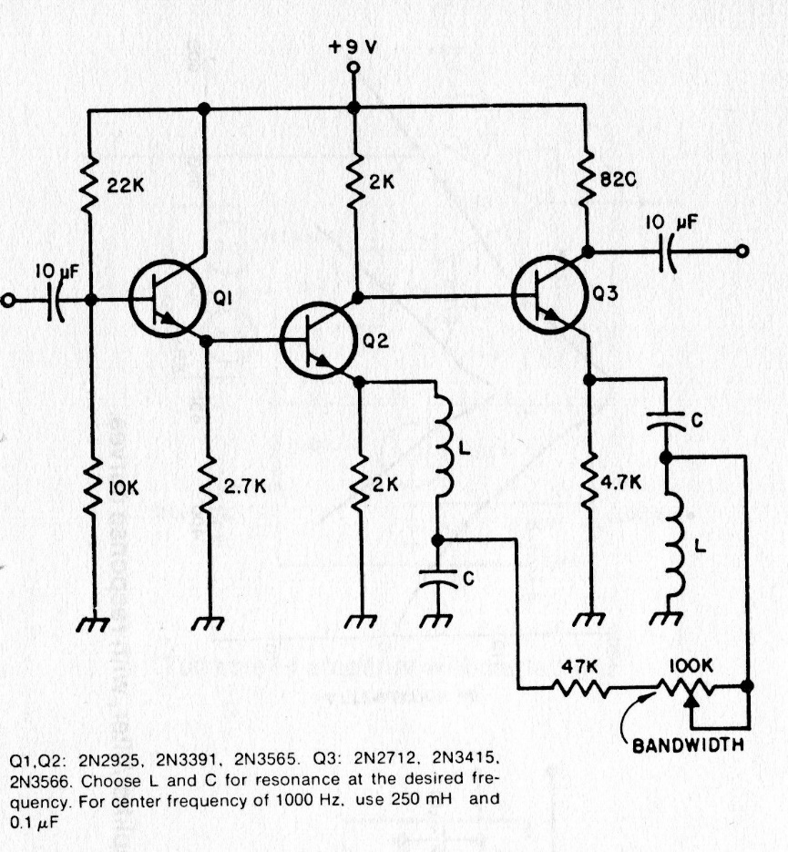 The transistors for this circuit from an 80's documentation can be the BC548 or 2B222 and the coils with the capacitors in parallel determine the frequency that it lets through. The power can be changed by changing some resistors.