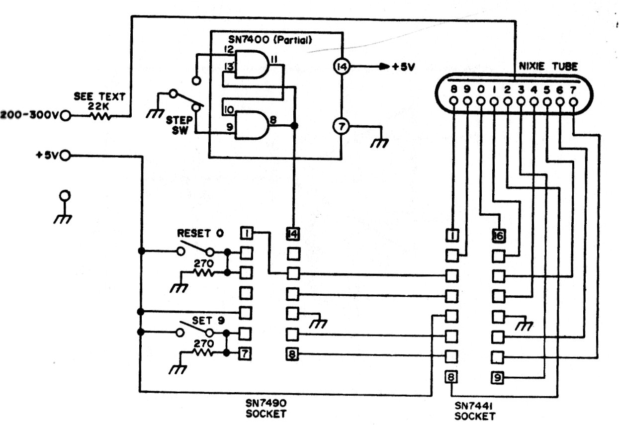 This is an old test circuit for integrated TTL counters, feeding a Nixie tube, common at the time. The circuit is from the 90's, not being given the power supply.