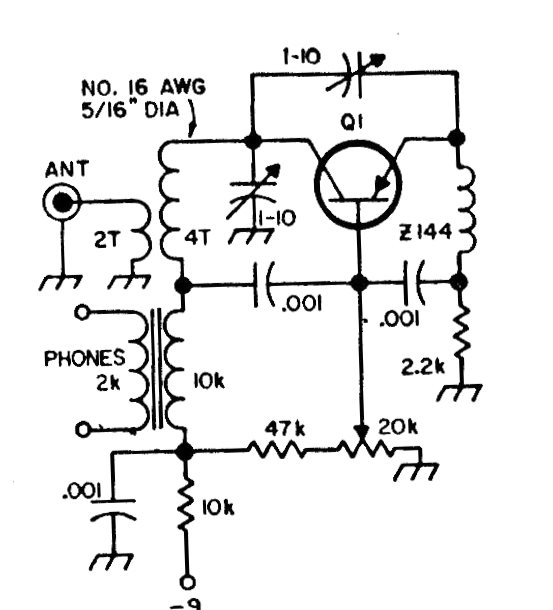 This simple super-regenerative receiver was found in American documentation from the 1980s. The transistor can be the BF494 or equivalent and the coils depend on the frequency you want to receive. The signal is applied to headphones or to an amplification stage.