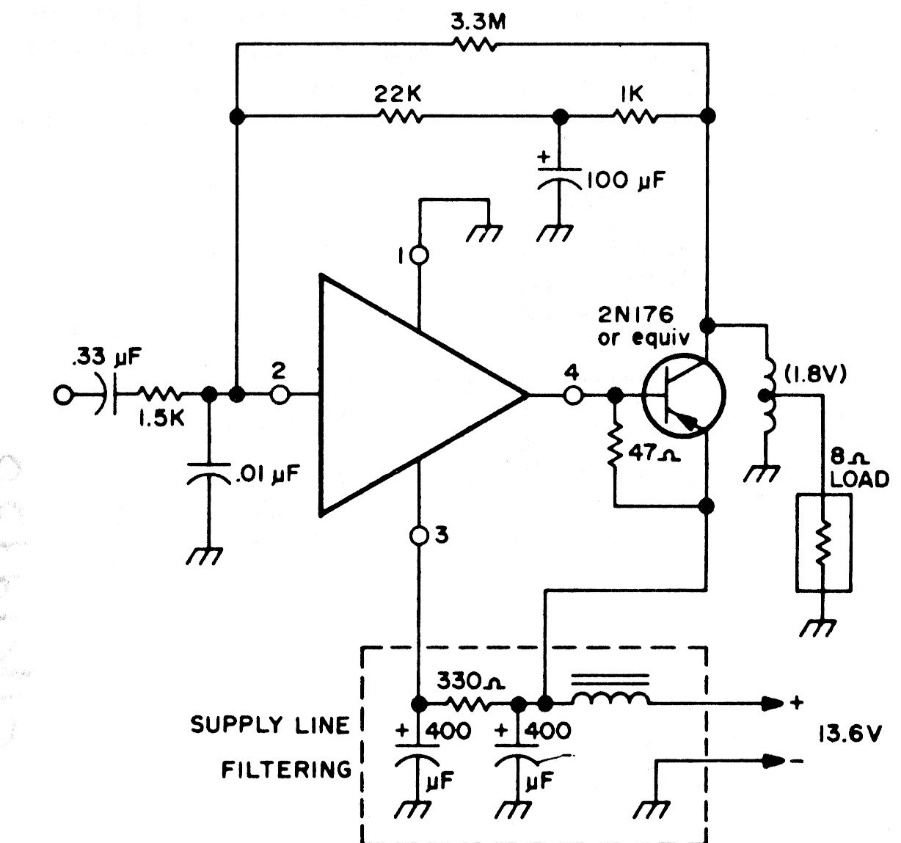 In this circuit, the integrated amplifier used is uncommon today. The circuit is from an American documentation from the 70's making use of a power transistor for output. A TIP32 can be used.