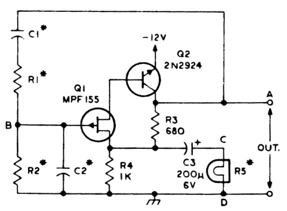 This oscillator generates a fixed frequency signal determined by C1 and C2. In the case of 1 nF, the signal will be 10 kHz for R1 and R2 15.8 k. These components can be changed to obtain other frequencies.
